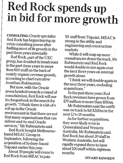 Naturally this is a summary of our conversation and I went into more detail about the consolidation trend I was seeing in the market as customers were demanding more of an end-to-end service. In many ways this explains our growth at the moment. We have been able to provide customers with a much more comprehensive consulting service because as Oracle has expanded its offering, so we have expanded our expertise and scope. The acquisition of Tripoint Online’s Peoplesoft expertise earlier this year is a great example of that. As that growth has come in depth, we have also expanded across ANZ, opening new offices in Perth recently and investing in our New Zealand practice (most recently with this acquisition of Jireh).